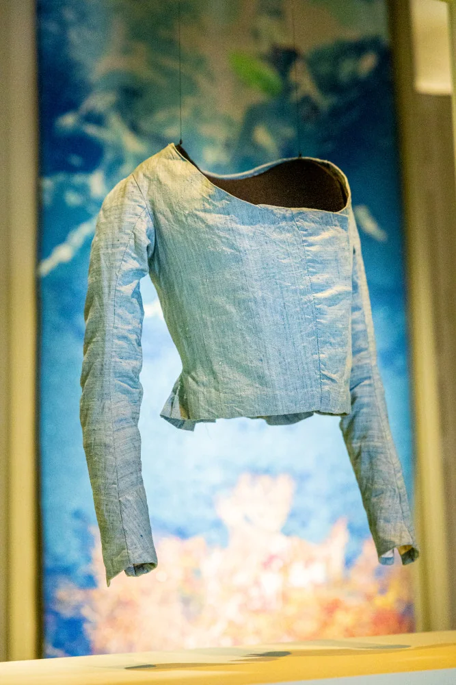 En écho à l’infinie variété des bleus des modèles Haute Couture des collections du musée (Chanel, Schiaparelli, Lanvin, Courrèges, Alaïa, Cardin, Balenciaga, Guy Laroche, Azzaro…) présentées en deux temps pour des raisons de conservation, les créations récentes de labels marseillais ou plus largement méditerranéens, lauréats du Fonds de Dotation Maison Mode Méditerranée, offrent une lecture particulièrement riche de cette couleur qui reste indissociablement liée aux rivages de la mer et à l’histoire de la Méditerranée.