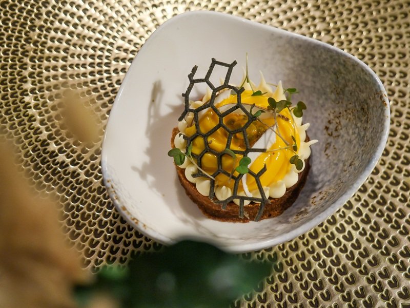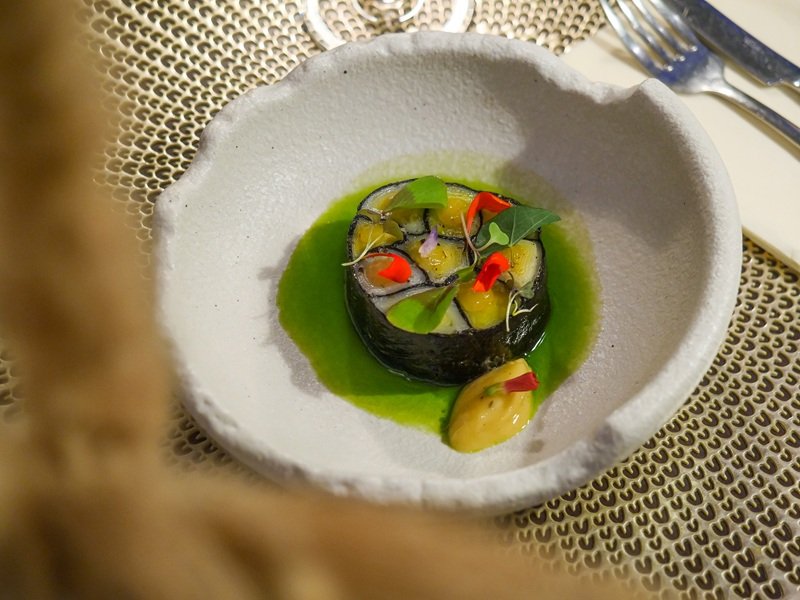 - Maki végétalien aux poireaux confits - Crémeux à l'huile d'olive, gelée de citron japonais, bouquet de fleurs