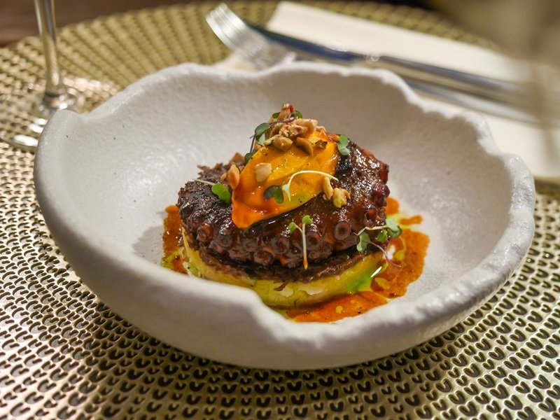 - Terre & Mer poulpe et joue de boeuf - Pulpe de pomme de terre, potimarron, noisettes, tempura de shiitake