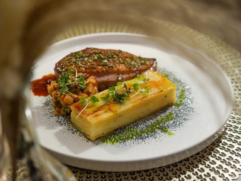 - Filet de canette rôti au romarin - Mille-feuille pomme de terre et panais, coing caramélisé, noix, jus de viande aux airelles